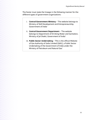 Digital Brand Identity Manual35The footer must state the lineage in the following manner for the different types of government organizations:i. Central Government Ministry - %u2018The website belongs toMinistry of Skill Development and Entrepreneurship, Government of India%u2019 ii. Central Government Department - %u2018The website belongs to Department of Drinking Water and Sanitation, Ministry of Jal Shakti, Government of India%u2019 iii. Public Sector Undertaking - %u2018This is the official Website of Gas Authority of India Limited (GAIL), a Public Sector Undertaking of the Government of India under the Ministry of Petroleum and Natural Gas%u2019