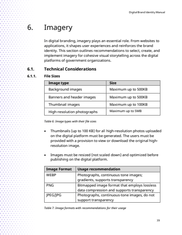 Digital Brand Identity Manual396. Imagery In digital branding, imagery plays an essential role. From websites to applications, it shapes user experiences and reinforces the brand identity. This section outlines recommendations to select, create, and implement imagery for cohesive visual storytelling across the digital platforms of government organizations. 6.1. Technical Considerations6.1.1. File SizesImage type SizeBackground images Maximum up to 500KBBanners and header images Maximum up to 500KBThumbnail images Maximum up to 100KB High-resolution photographs Maximum up to 5MB Table 6: Image types with their file sizes%u2022 Thumbnails (up to 100 KB) for all high-resolution photos uploaded on the digital platform must be generated. The users must be provided with a provision to view or download the original highresolution image.%u2022 Images must be resized (not scaled down) and optimized before publishing on the digital platform. Image Format Usage recommendationWEBP Photographs, continuous tone images; gradients, supports transparencyPNG Bitmapped image format that employs lossless data compression and supports transparencyJPEG/JPG Photographs, continuous-tone images, do not support transparency Table 7: Image formats with recommendations for their usage