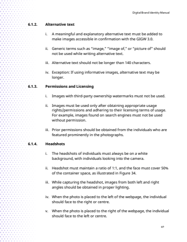 Digital Brand Identity Manual406.1.2. Alternative texti. A meaningful and explanatory alternative text must be added to make images accessible in confirmation with the GIGW 3.0.ii. Generic terms such as %u201cimage,%u201d %u201cimage of,%u201d or %u201cpicture of%u201d should not be used while writing alternative text.iii. Alternative text should not be longer than 140 characters.iv. Exception: If using informative images, alternative text may be longer.6.1.3. Permissions and Licensingi. Images with third-party ownership watermarks must not be used.ii. Images must be used only after obtaining appropriate usage rights/permissions and adhering to their licensing terms of usage. For example, images found on search engines must not be used without permission. iii. Prior permissions should be obtained from the individuals who are featured prominently in the photographs.6.1.4. Headshots i. The headshots of individuals must always be on a white background, with individuals looking into the camera. ii. Headshot must maintain a ratio of 1:1, and the face must cover 50% of the container space, as illustrated in Figure 34.iii. While capturing the headshot, images from both left and right angles should be obtained in proper lighting.iv. When the photo is placed to the left of the webpage, the individual should face to the right or centre.v. When the photo is placed to the right of the webpage, the individual should face to the left or centre.
