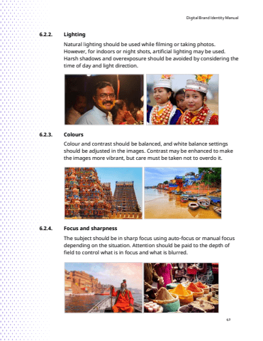 Digital Brand Identity Manual426.2.2. LightingNatural lighting should be used while filming or taking photos. However, for indoors or night shots, artificial lighting may be used. Harsh shadows and overexposure should be avoided by considering the time of day and light direction.6.2.3. ColoursColour and contrast should be balanced, and white balance settings should be adjusted in the images. Contrast may be enhanced to make the images more vibrant, but care must be taken not to overdo it.6.2.4. Focus and sharpness The subject should be in sharp focus using auto-focus or manual focus depending on the situation. Attention should be paid to the depth of field to control what is in focus and what is blurred.
