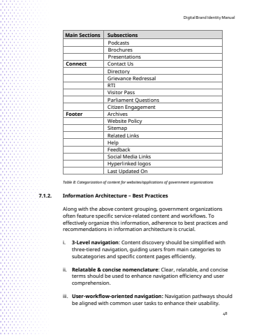 Digital Brand Identity Manual48Main Sections Subsections PodcastsBrochuresPresentationsConnect Contact UsDirectory Grievance RedressalRTIVisitor PassParliament QuestionsCitizen EngagementFooter Archives Website Policy SitemapRelated LinksHelpFeedbackSocial Media LinksHyperlinked logosLast Updated OnTable 8: Categorization of content for websites/applications of government organizations7.1.2. Information Architecture %u2013 Best Practices Along with the above content grouping, government organizationsoften feature specific service-related content and workflows. To effectively organize this information, adherence to best practices and recommendations in information architecture is crucial. i. 3-Level navigation: Content discovery should be simplified with three-tiered navigation, guiding users from main categories to subcategories and specific content pages efficiently.ii. Relatable & concise nomenclature: Clear, relatable, and concise terms should be used to enhance navigation efficiency and user comprehension.iii. User-workflow-oriented navigation: Navigation pathways should be aligned with common user tasks to enhance their usability.