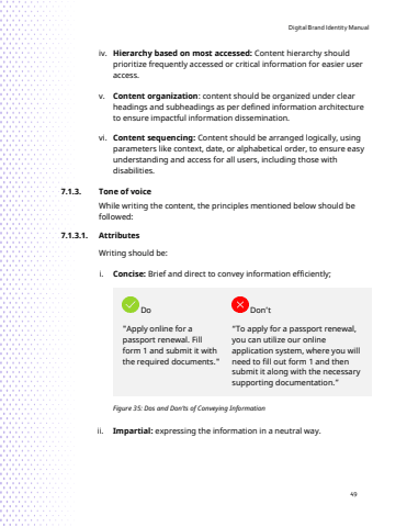 Digital Brand Identity Manual49iv. Hierarchy based on most accessed: Content hierarchy should prioritize frequently accessed or critical information for easier user access.v. Content organization: content should be organized under clear headings and subheadings as per defined information architecture to ensure impactful information dissemination.vi. Content sequencing: Content should be arranged logically, using parameters like context, date, or alphabetical order, to ensure easy understanding and access for all users, including those with disabilities.7.1.3. Tone of voiceWhile writing the content, the principles mentioned below should be followed:7.1.3.1. Attributes Writing should be:i. Concise: Brief and direct to convey information efficiently;Do Don%u2019t\ online for a passport renewal. Fill form 1 and submit it with the required documents.\%u201cTo apply for a passport renewal, you can utilize our online application system, where you will need to fill out form 1 and then submit it along with the necessary supporting documentation.%u201dFigure 35: Dos and Don%u2019ts of Conveying Informationii. Impartial: expressing the information in a neutral way.