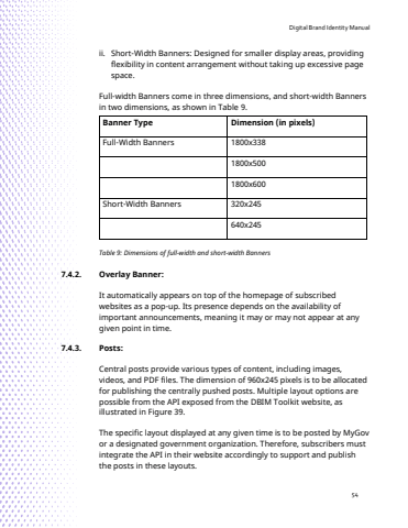 Digital Brand Identity Manual54ii. Short-Width Banners: Designed for smaller display areas, providing flexibility in content arrangement without taking up excessive page space. Full-width Banners come in three dimensions, and short-width Banners in two dimensions, as shown in Table 9.Banner Type Dimension (in pixels)Full-Width Banners 1800x3381800x5001800x600Short-Width Banners 320x245640x245Table 9: Dimensions of full-width and short-width Banners7.4.2. Overlay Banner: It automatically appears on top of the homepage of subscribed websites as a pop-up. Its presence depends on the availability of important announcements, meaning it may or may not appear at any given point in time.7.4.3. Posts: Central posts provide various types of content, including images, videos, and PDF files. The dimension of 960x245 pixels is to be allocated for publishing the centrally pushed posts. Multiple layout options are possible from the API exposed from the DBIM Toolkit website, as illustrated in Figure 39.The specific layout displayed at any given time is to be posted by MyGov or a designated government organization. Therefore, subscribers must integrate the API in their website accordingly to support and publish the posts in these layouts.