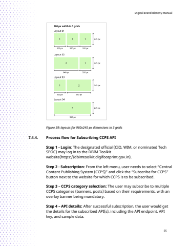 Digital Brand Identity Manual55Figure 39: layouts for 960x245 px dimensions in 3 grids 7.4.4. Process flow for Subscribing CCPS APIStep 1 - Login: The designated official (CIO, WIM, or nominated Tech SPOC) may log in to the DBIM Toolkitwebsite(https://dbimtoolkit.digifootprint.gov.in).Step 2 - Subscription: From the left menu, user needs to select %u201cCentral Content Publishing System (CCPS)%u201d and click the %u201cSubscribe for CCPS%u201d button next to the website for which CCPS is to be subscribed.Step 3 %u2013 CCPS category selection: The user may subscribe to multiple CCPS categories (banners, posts) based on their requirements, with an overlay banner being mandatory.Step 4 %u2013 API details: After successful subscription, the user would get the details for the subscribed API(s), including the API endpoint, API key, and sample data.
