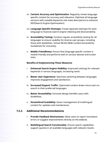 Digital Brand Identity Manual60vii. Content Accuracy and Optimization: Regularly review languagespecific content for accuracy and relevance. Optimize all language versions with suitable keywords and meta descriptions to enhance SEO(Search Engine Optimization).viii. Language-Specific Sitemaps: Create separate sitemaps for each language to improve search engine indexing and discoverability.ix. Accessibility Testing: Conduct regular accessibility testing for all languages to ensure usability for diverse user groups, including those with disabilities. Follow WCAG (Web Content Accessibility Guidelines) for inclusivity.x. Mobile Friendliness: Ensure that language-specific content is mobile-friendly and performs well on various devices and screen sizes.Benefits of Implementing These Measuresi. Enhanced Search Engine Visibility: Improved rankings for relevant keywords in various languages, increasing reach.ii. Better User Experience: Seamless switching between languages improves engagement and satisfaction.iii. Increased Organic Traffic: Optimized content draws more users to search in their preferred languages.iv. Better Accessibility: Inclusive design benefits users with disabilities.v. Streamlined Scalability: Easier management of multilingual content for updates and maintenance.7.5.3. Additional Recommendationsi. Provide Feedback Mechanisms: Allow users to report translation errors or suggest improvements directly on the website.ii. Multilingual Search Functionality: Ensure search capabilities support queries in all available languages with relevant results.
