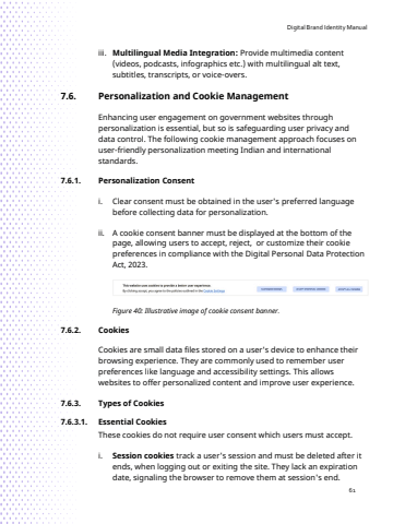 Digital Brand Identity Manual61iii. Multilingual Media Integration: Provide multimedia content (videos, podcasts, infographics etc.) with multilingual alt text,subtitles, transcripts, or voice-overs.7.6. Personalization and Cookie ManagementEnhancing user engagement on government websites through personalization is essential, but so is safeguarding user privacy and data control. The following cookie management approach focuses on user-friendly personalization meeting Indian and international standards.7.6.1. Personalization Consent i. Clear consent must be obtained in the user's preferred language before collecting data for personalization.ii. A cookie consent banner must be displayed at the bottom of the page, allowing users to accept, reject, or customize their cookie preferences in compliance with the Digital Personal Data Protection Act, 2023.Figure 40: Illustrative image of cookie consent banner.7.6.2. CookiesCookies are small data files stored on a user's device to enhance their browsing experience. They are commonly used to remember user preferences like language and accessibility settings. This allows websites to offer personalized content and improve user experience.7.6.3. Types of Cookies 7.6.3.1. Essential CookiesThese cookies do not require user consent which users must accept.i. Session cookies track a user's session and must be deleted after it ends, when logging out or exiting the site. They lack an expiration date, signaling the browser to remove them at session's end.