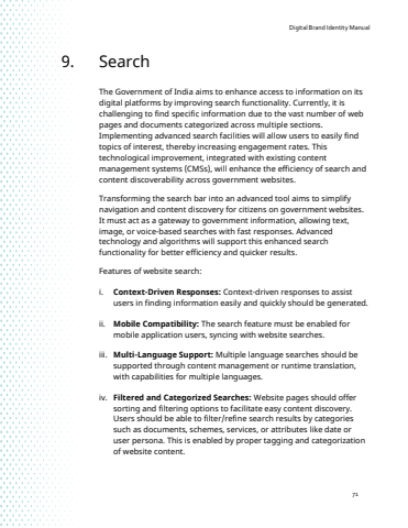 Digital Brand Identity Manual719. Search The Government of India aims to enhance access to information on its digital platforms by improving search functionality. Currently, it is challenging to find specific information due to the vast number of web pages and documents categorized across multiple sections. Implementing advanced search facilities will allow users to easily find topics of interest, thereby increasing engagement rates. This technological improvement, integrated with existing content management systems (CMSs), will enhance the efficiency of search and content discoverability across government websites.Transforming the search bar into an advanced tool aims to simplify navigation and content discovery for citizens on government websites. It must act as a gateway to government information, allowing text, image, or voice-based searches with fast responses. Advanced technology and algorithms will support this enhanced search functionality for better efficiency and quicker results.Features of website search:i. Context-Driven Responses: Context-driven responses to assist users in finding information easily and quickly should be generated.ii. Mobile Compatibility: The search feature must be enabled for mobile application users, syncing with website searches.iii. Multi-Language Support: Multiple language searches should be supported through content management or runtime translation, with capabilities for multiple languages.iv. Filtered and Categorized Searches: Website pages should offer sorting and filtering options to facilitate easy content discovery. Users should be able to filter/refine search results by categories such as documents, schemes, services, or attributes like date or user persona. This is enabled by proper tagging and categorization of website content.