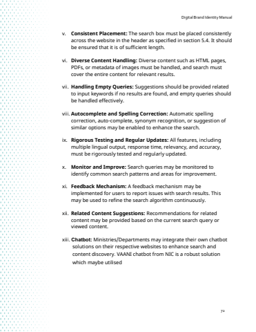 Digital Brand Identity Manual72v. Consistent Placement: The search box must be placed consistently across the website in the header as specified in section 5.4. It shouldbe ensured that it is of sufficient length.vi. Diverse Content Handling: Diverse content such as HTML pages,PDFs, or metadata of images must be handled, and search must cover the entire content for relevant results.vii. Handling Empty Queries: Suggestions should be provided related to input keywords if no results are found, and empty queries shouldbe handled effectively.viii. Autocomplete and Spelling Correction: Automatic spelling correction, auto-complete, synonym recognition, or suggestion ofsimilar options may be enabled to enhance the search.ix. Rigorous Testing and Regular Updates: All features, including multiple lingual output, response time, relevancy, and accuracy, must be rigorously tested and regularly updated.x. Monitor and Improve: Search queries may be monitored to identify common search patterns and areas for improvement.xi. Feedback Mechanism: A feedback mechanism may be implemented for users to report issues with search results. Thismay be used to refine the search algorithm continuously.xii. Related Content Suggestions: Recommendations for related content may be provided based on the current search query orviewed content.xiii. Chatbot: Ministries/Departments may integrate their own chatbot solutions on their respective websites to enhance search and content discovery. VAANI chatbot from NIC is a robust solution which maybe utilised