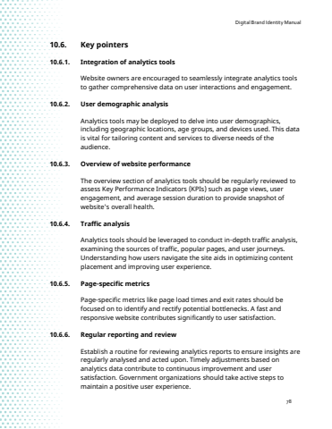 Digital Brand Identity Manual7810.6. Key pointers10.6.1. Integration of analytics toolsWebsite owners are encouraged to seamlessly integrate analytics tools to gather comprehensive data on user interactions and engagement.10.6.2. User demographic analysisAnalytics tools may be deployed to delve into user demographics, including geographic locations, age groups, and devices used. This data is vital for tailoring content and services to diverse needs of the audience.10.6.3. Overview of website performanceThe overview section of analytics tools should be regularly reviewed to assess Key Performance Indicators (KPIs) such as page views, user engagement, and average session duration to provide snapshot of website's overall health.10.6.4. Traffic analysisAnalytics tools should be leveraged to conduct in-depth traffic analysis, examining the sources of traffic, popular pages, and user journeys.Understanding how users navigate the site aids in optimizing content placement and improving user experience.10.6.5. Page-specific metricsPage-specific metrics like page load times and exit rates should be focused on to identify and rectify potential bottlenecks. A fast and responsive website contributes significantly to user satisfaction.10.6.6. Regular reporting and reviewEstablish a routine for reviewing analytics reports to ensure insights are regularly analysed and acted upon. Timely adjustments based on analytics data contribute to continuous improvement and user satisfaction. Government organizations should take active steps to maintain a positive user experience.